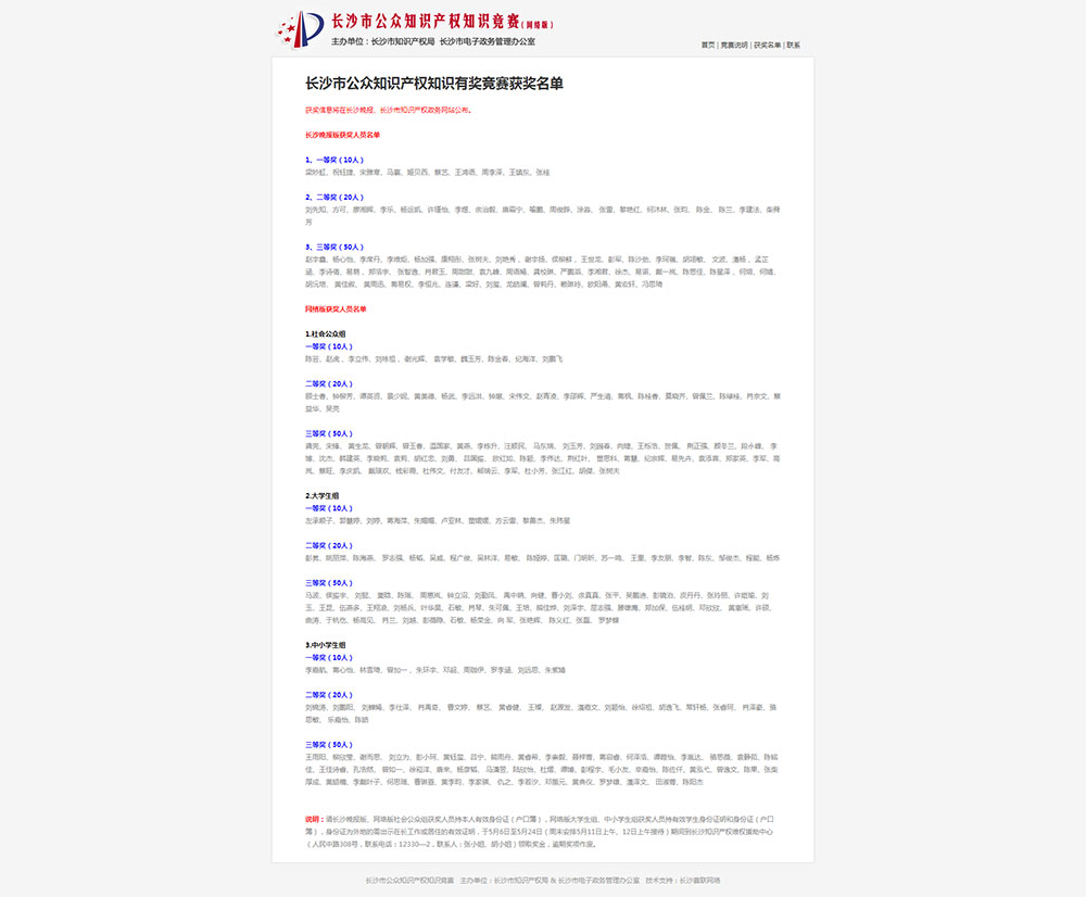 競賽說明 1、本次網(wǎng)絡(luò)競賽活動由長沙市知識產(chǎn)權(quán)局聯(lián)合長沙市電子政務(wù)管理辦公室共同舉辦,旨在進一步加強知識產(chǎn)權(quán)宣傳普及,提升社會公眾知識產(chǎn)權(quán)意識。 2、活動原則上僅限于長沙市轄區(qū)內(nèi)公眾參與,政府知識產(chǎn)權(quán)管理部門工作人員不參加競賽。分社會公眾組、大學(xué)生組、中小學(xué)生組三組,每組各設(shè)一等獎10名,每名獎金1000元;二等獎20名,每名獎金400元;三等獎50名,每名獎金200元。答題截止日期為2013年4月20日24時。主辦單位按照分?jǐn)?shù)高低確定獲獎人員,分?jǐn)?shù)相同的,在公證人員的監(jiān)督