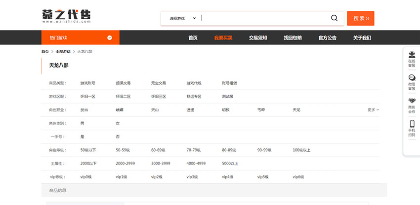 每個游戲有共同的字段:游戲名稱、類別(端游、手游、其它)、商品類型、服務(wù)保障、角色、功力值、價格等。